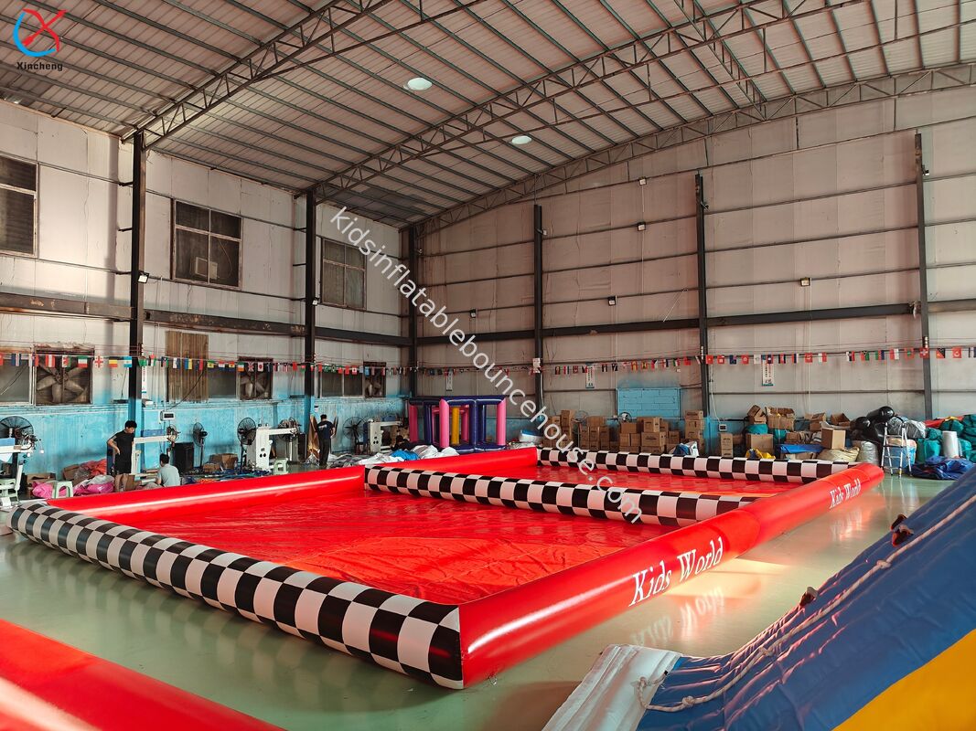 Κόκκινη φουσκωτή πισίνα με φούσκα σχεδιασμένη για εμπορική χρήση σε εξωτερικούς χώρους, με ανθεκτική κατασκευή και ζωηρή σχεδίαση.